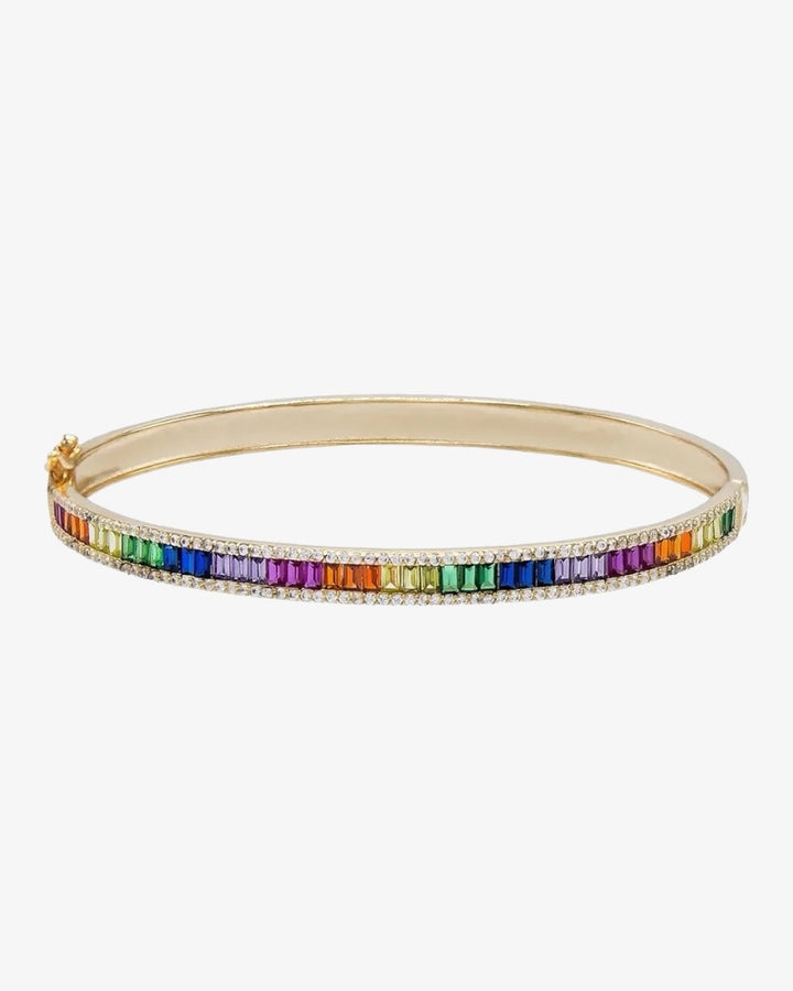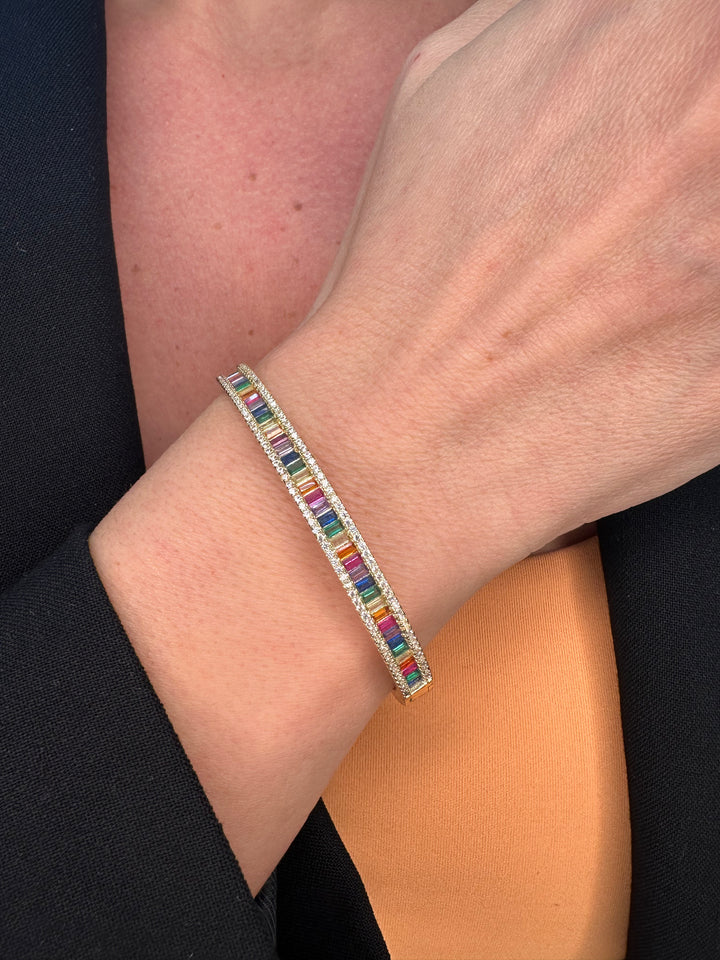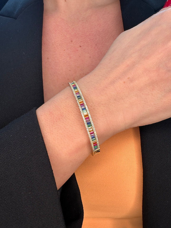 اكتشفي قمة الأناقة مع سوار بانجل متعدد الألوان، المرصّع بأحجار الزركون البراقة. هذه القطعة الفاخرة تُضفي لمسةً من الرقي على أي إطلالة. مثالية لمن يُقدّرون الإكسسوارات الفاخرة والحصرية.