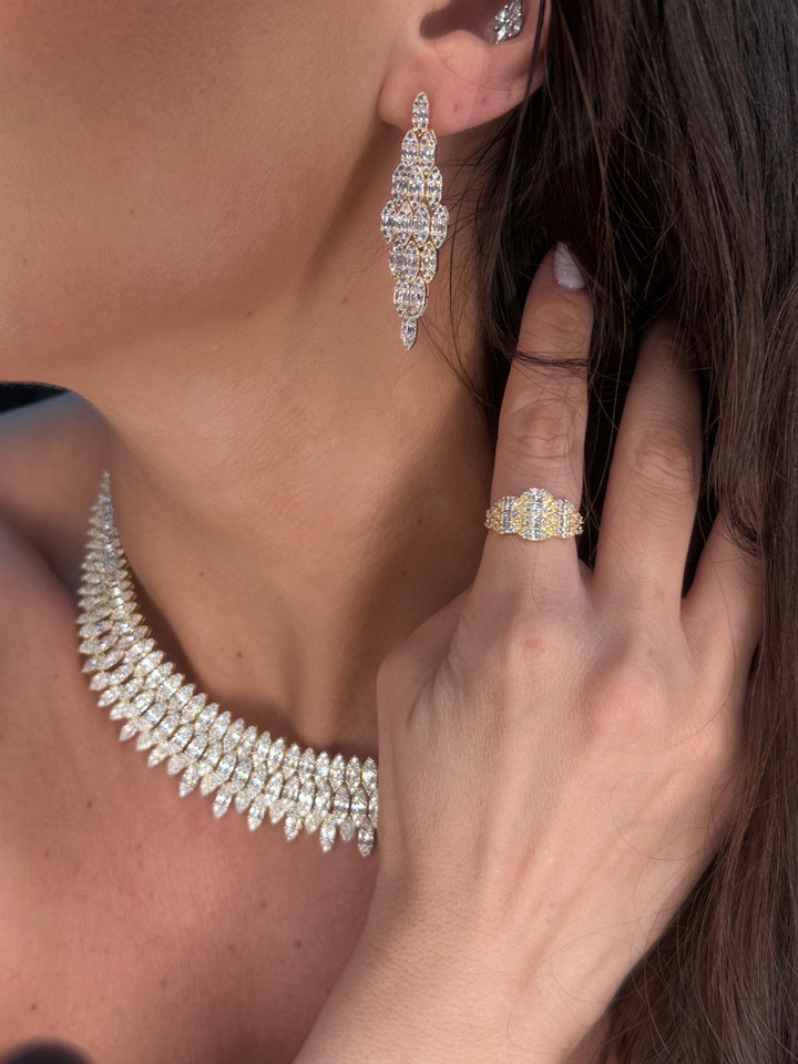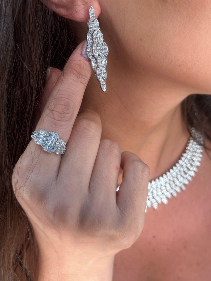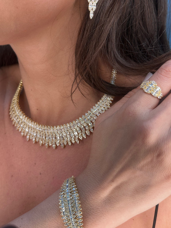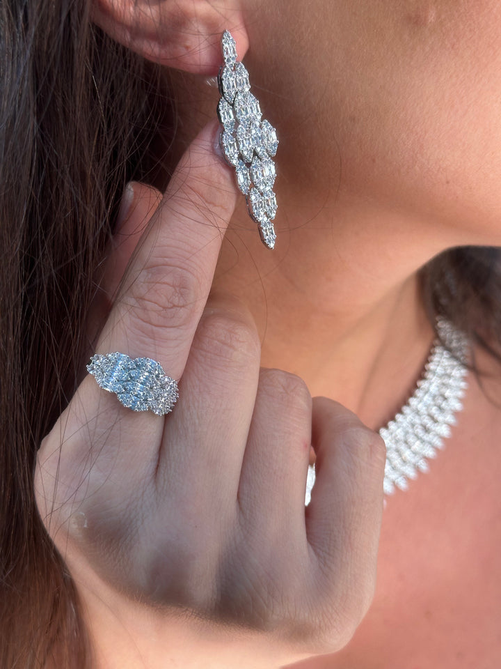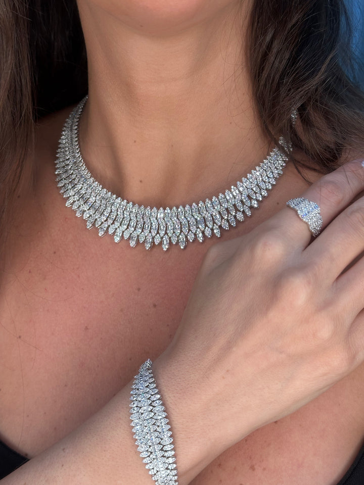 Diamond Look features a refined silver and gold-plated finish with exceptional brilliance. This elegant set includes four pieces: a necklace, bracelet, ring, and earrings, all crafted to a superior standard for a stunning, coordinated appearance.