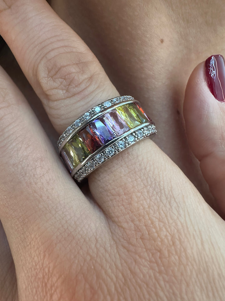 استمتعي بأناقة فاخرة مع خاتمنا متعدد الألوان، المصنوع من الفضة الإسترلينية عيار 925 العريضة، والمرصّع بأحجار زركونيا مكعبة لامعة بألوان قوس قزح، مقطوعة على شكل باغيت وأميرة. متوفر بمقاس 7، سيُضفي هذا الخاتم المميز لمسةً من الأناقة على أي إطلالة بتصميمه الراقي والحصري.