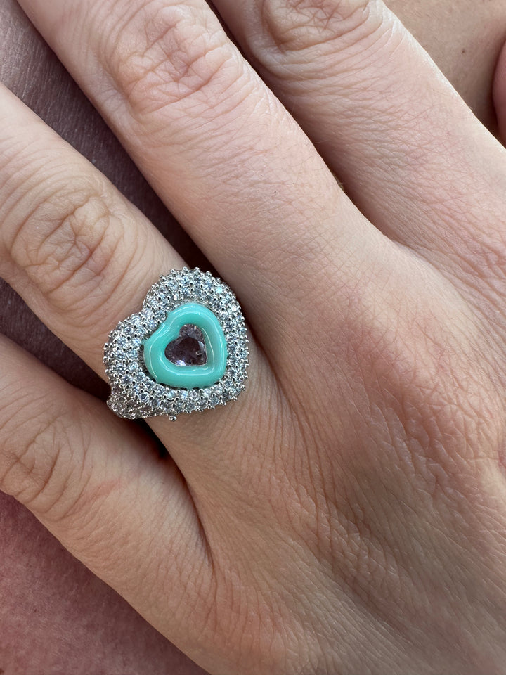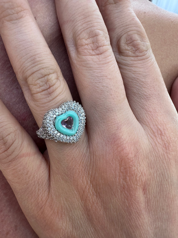 من المؤكد أن هذا الخاتم الصغير العصري الجديد، ذو النهاية المطلية بالفضة والحجر على شكل قلب باللون الوردي، سوف يجذب انتباه أي فرد مهتم بالموضة.