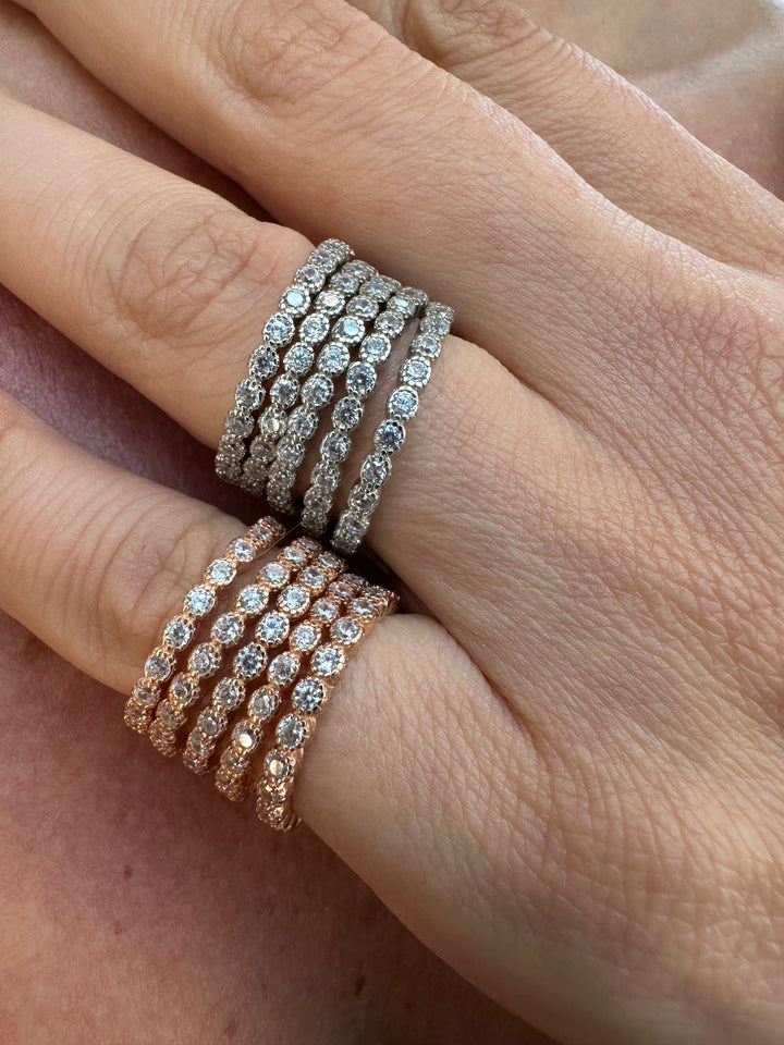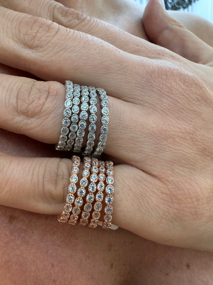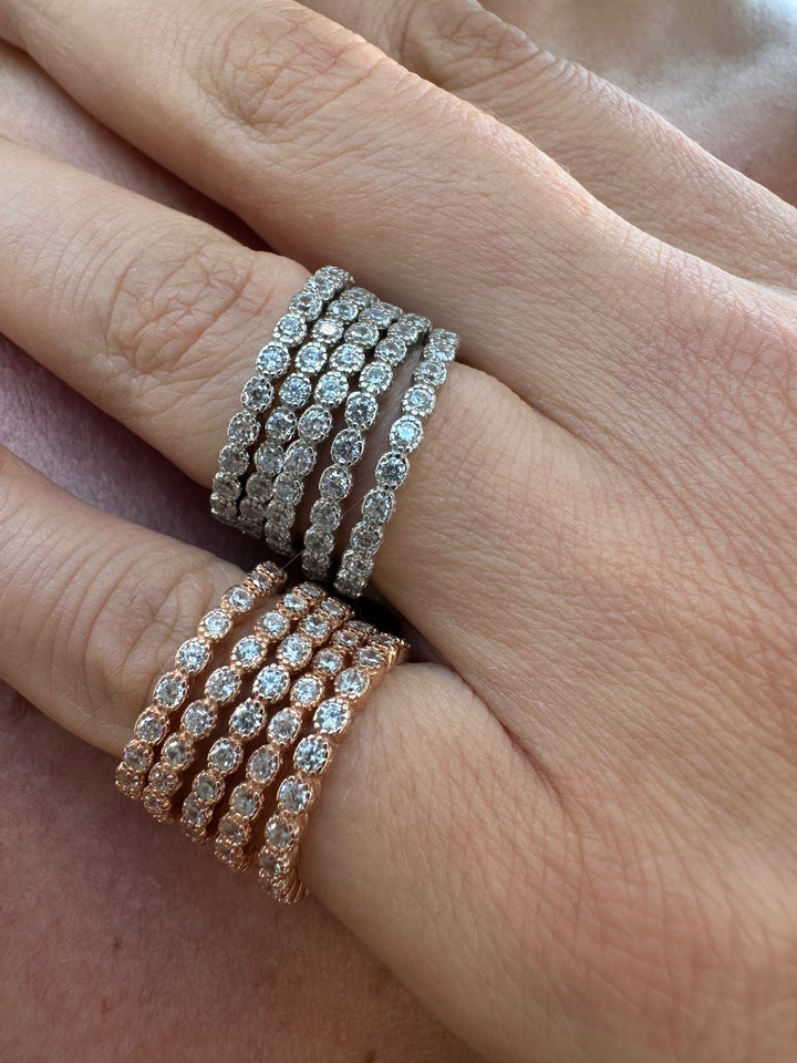 تتضمن مجموعة الخواتم الوردية هذه ثلاثة ألوان أنيقة: الفضي والذهبي والذهبي الوردي، وكلها مصنوعة من الفضة الإسترلينية عالية الجودة.