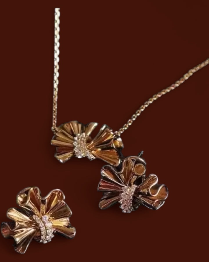 Delicately crafted pleated ribbon necklace and earrings set, embodying elegant luxury with a soft and charming design, perfect for weddings and engagements.