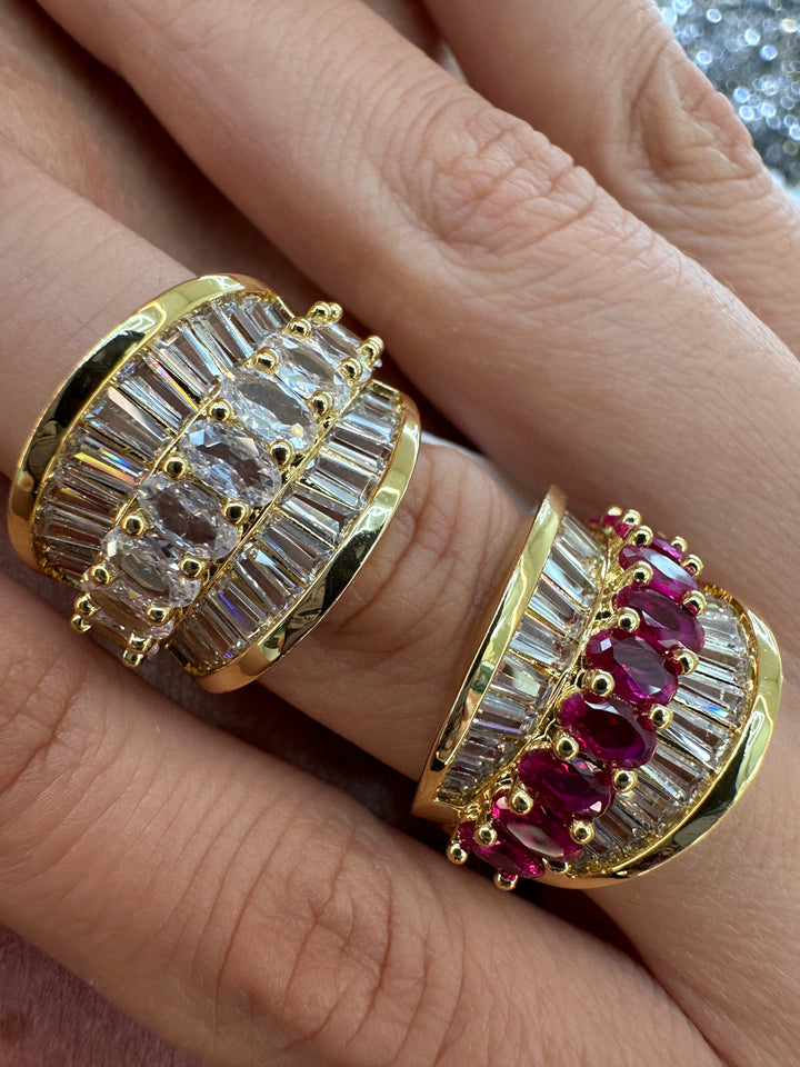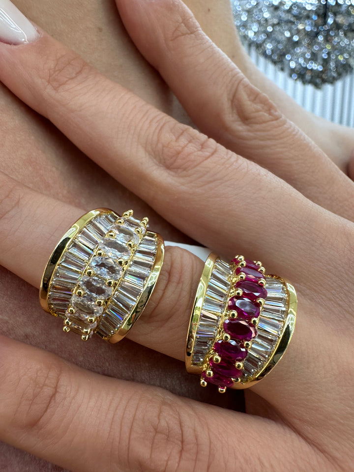 This new adjustable ring features a radiant ruby and white éclat design, crafted with high-quality gold plating and adorned with premium cubic zirconia stones.