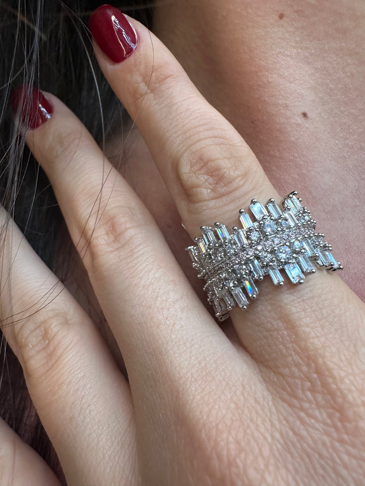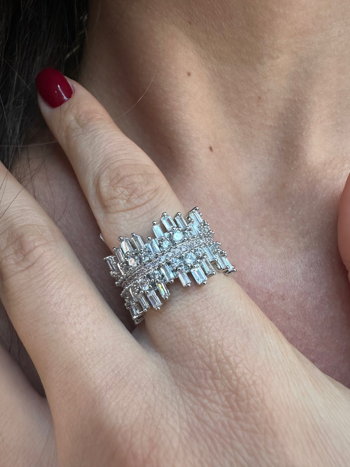 This size 7 ring features a silver-plated band adorned with brilliantly shining zircon stones, offering an elegant and refined accessory choice.