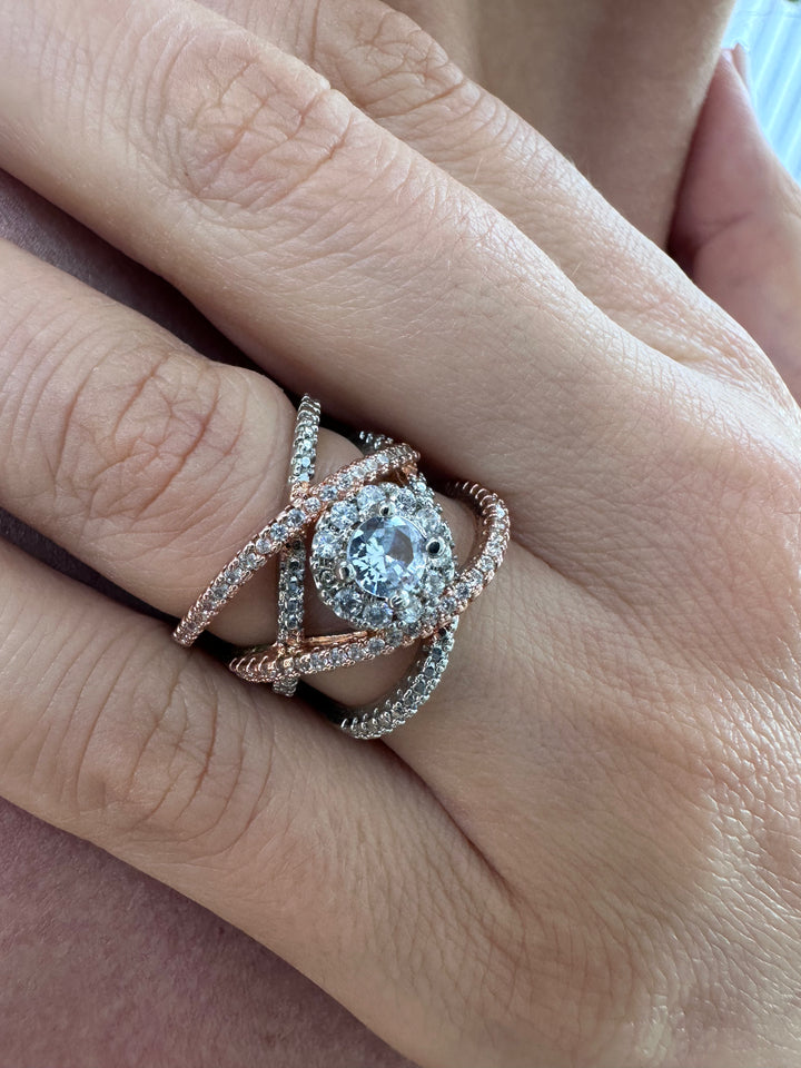The X Ring is designed for everyday wear, perfect for weddings and engagements. It is available in size 7, featuring elegant rose gold and silver finishes.