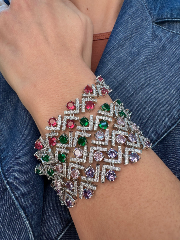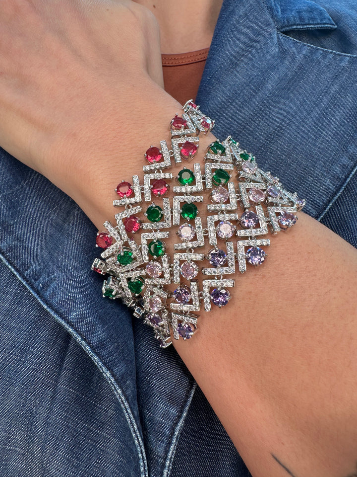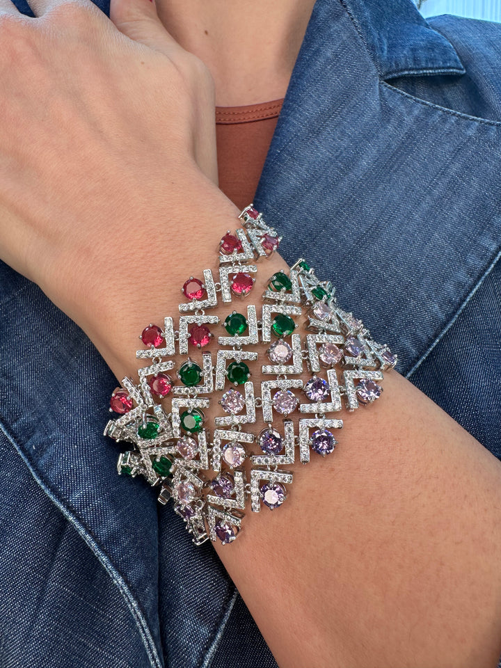 This silver-plated zigzag bracelet is available in an elegant selection of colors, including soft red, green, pink, and purple tones.