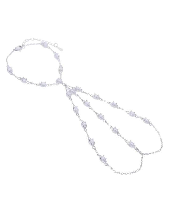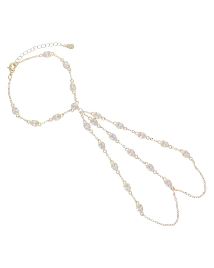 Elevate your wrist with this exquisite hand chain, a contemporary piece that seamlessly blends elegance with modern design. Featuring delicate micro pavé cubic zirconia stations set in lustrous gold toning, this sophisticated bracelet captures light beautifully with every movement. The charm-adorned design pairs effortlessly with the coordinating ring, creating a cohesive jewelry ensemble perfect for the discerning woman. Ideal for layering or wearing solo, this refined accessory brings a touch of luxury to any occasion, whether casual or formal.