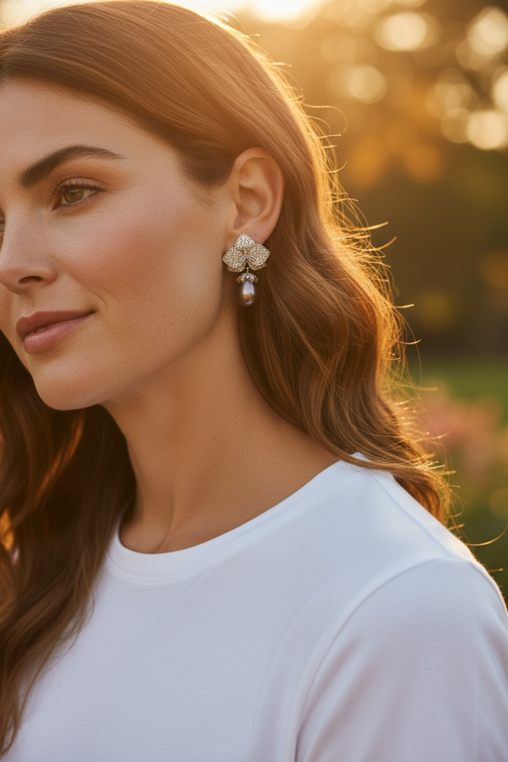 Experience the sophistication of our Lotus earrings, adorned with zircon micro inlays and designed in a petal droplet shape. These premium earrings feature a luxurious S925 silver needle and a lustrous purple pearl, creating a piece that exudes elegance and exclusivity.