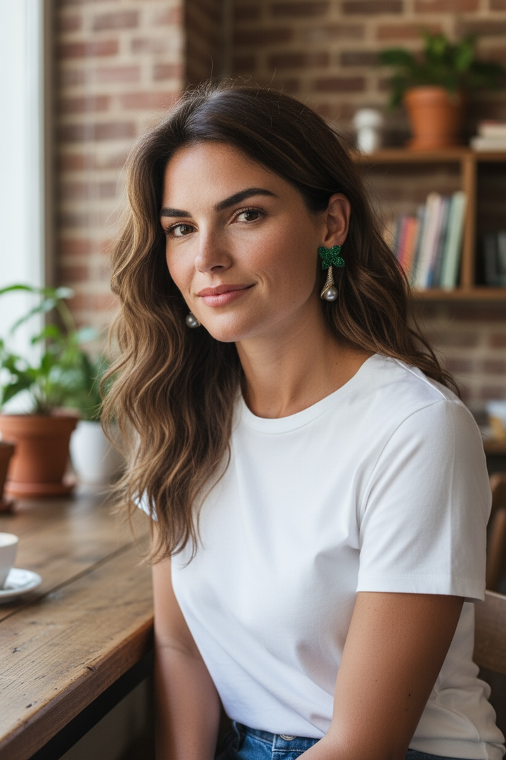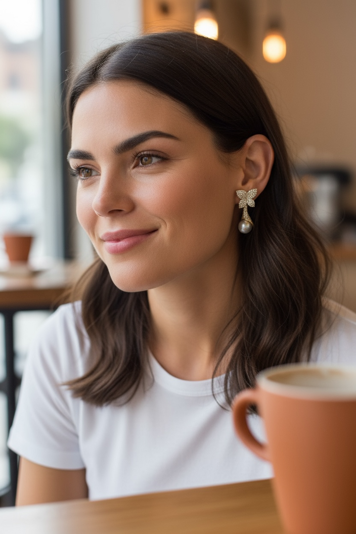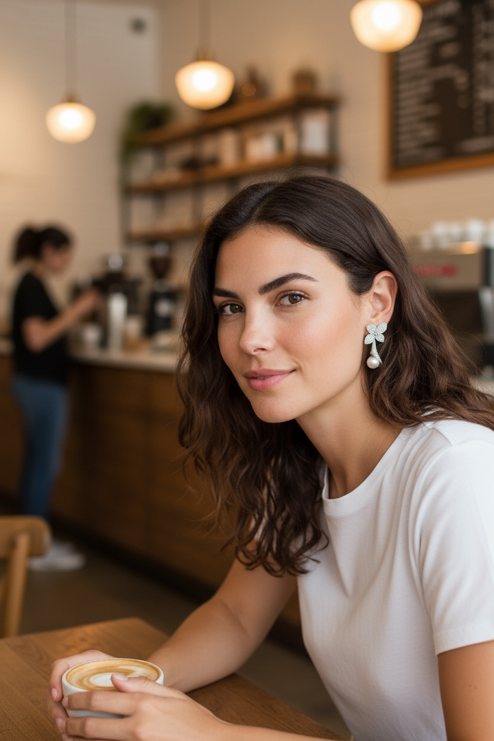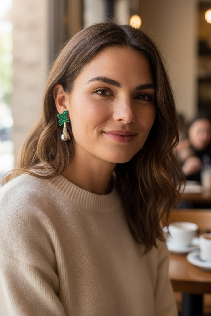 Indulge in sophistication with our Flower with pearl earrings. These exquisite drops feature delicate leaves and a lustrous pearl pendant. Elevate any outfit with these luxurious and artistic statement pieces, perfect for any occasion.